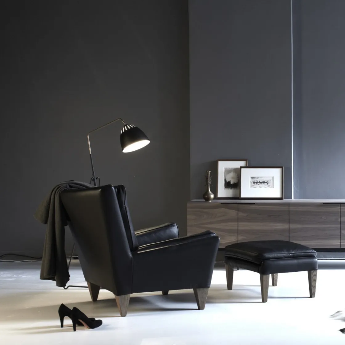 Lean er tilgjengelig i matt svart og hvit teksturfarge. Gulvlampens skrå arm strekker seg praktisk over en sofa eller lenestol, og den justerbare skjermen gir et komfortabelt leselys.
