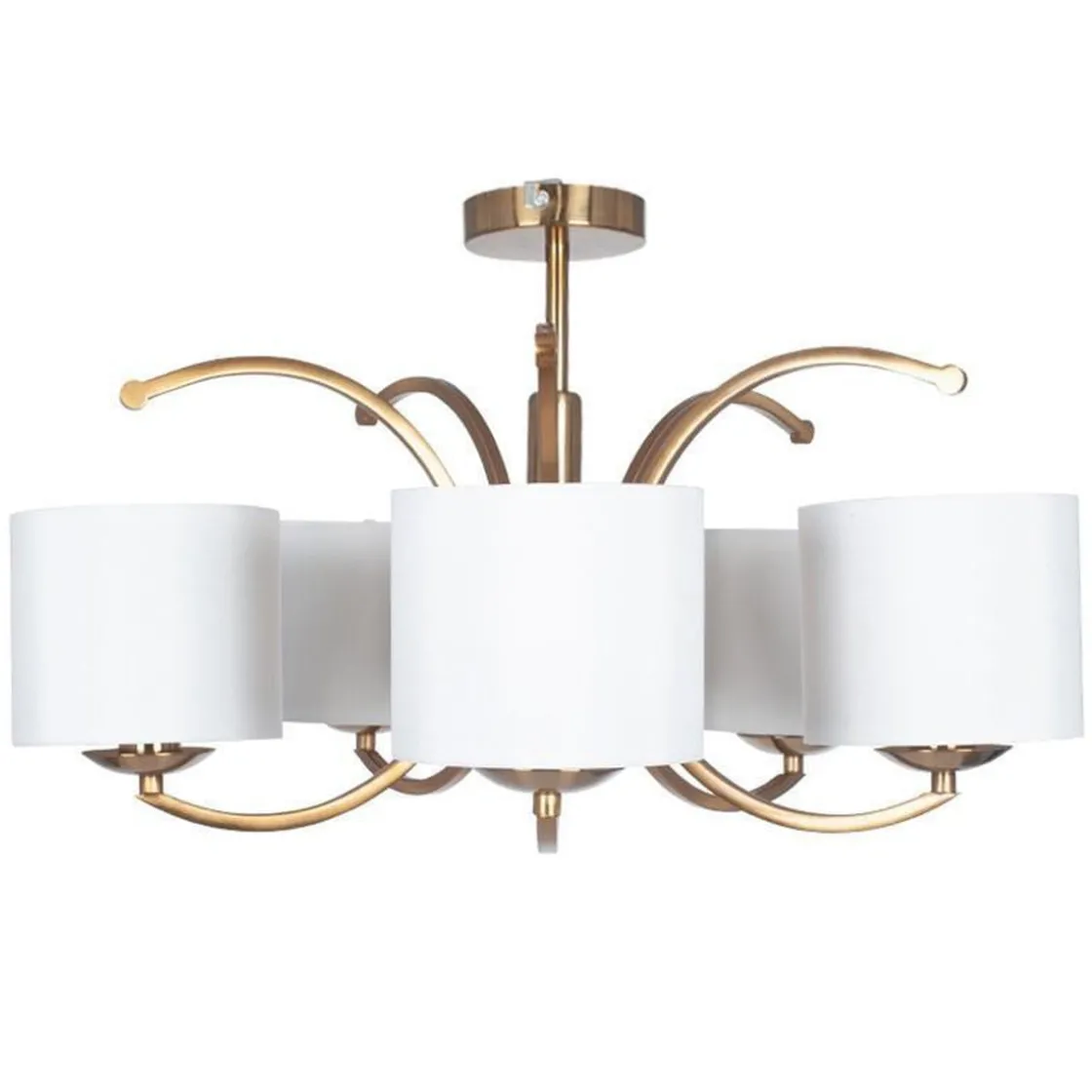 Taklampe med 3 armer i messing. Hver arm er utstyrt med en rund lys skjerm. Skjermene er laget av glatt bomullstoff.