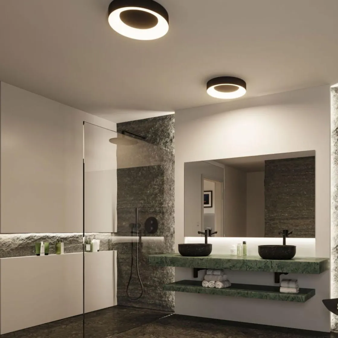 Casca-takarmaturen Svart matt med en effekt på 23W gir en spesiell lyseffekt: Når den er slått på, lyser kun innerkanten, uten at lys kommer ut av midten. Ved å trykke på lysbryteren i tre trinn justeres lysfargen: Dagslys hvit – Våkn opp! Nøytral hvit – Make up! Varm hvit – Slapp av!