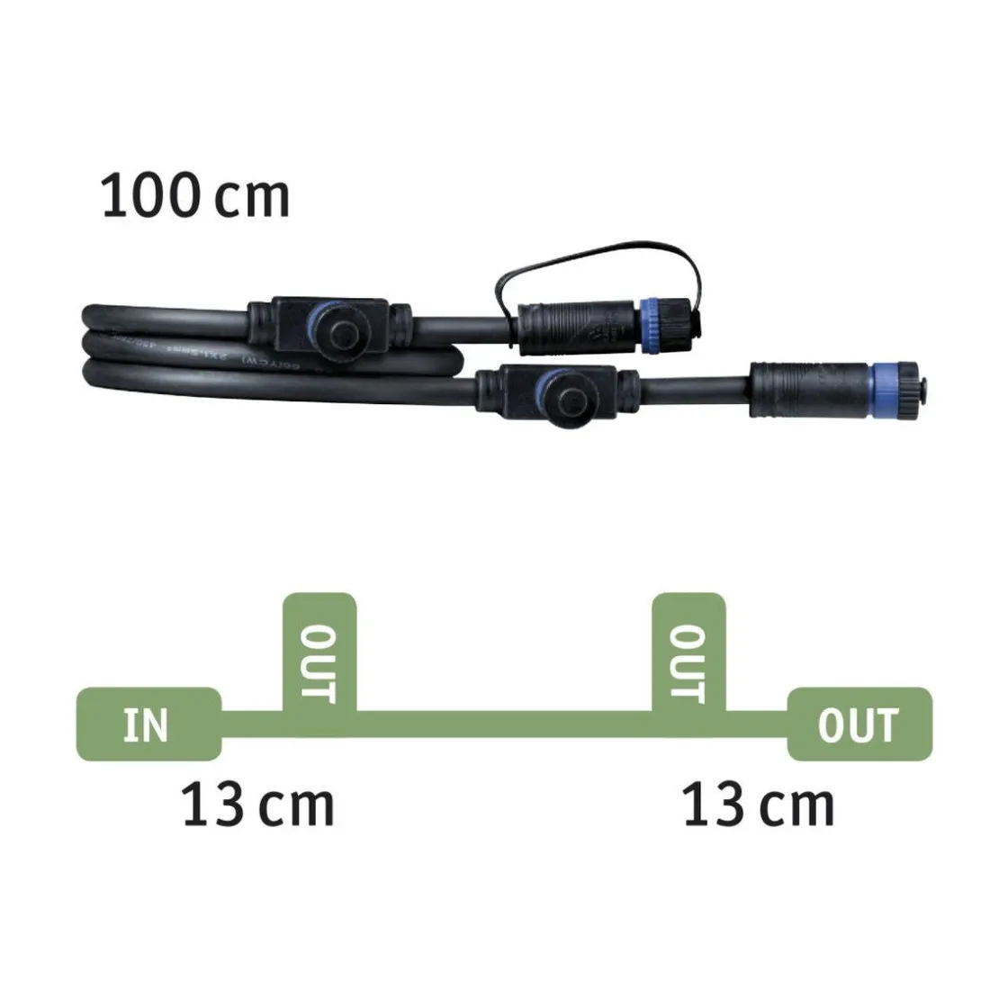Plug & Shine-tilkoblingskabelen bygger bro over avstander på opptil én meter og muliggjør tilkobling av tre ekstra armaturer eller ekstra tilbehør. Ubrukte tilkoblingsporter kan forsegles med dekkhettene som følger med for å garantere IP68 nedsenkingsbeskyttelse. Kombinert med armaturer og transformatorer i Plug & Shine-serien, lyser de opp uterommene dine i henhold til dine personlige preferanser: fra husvegger eller terrasser, til hagestier og planter.