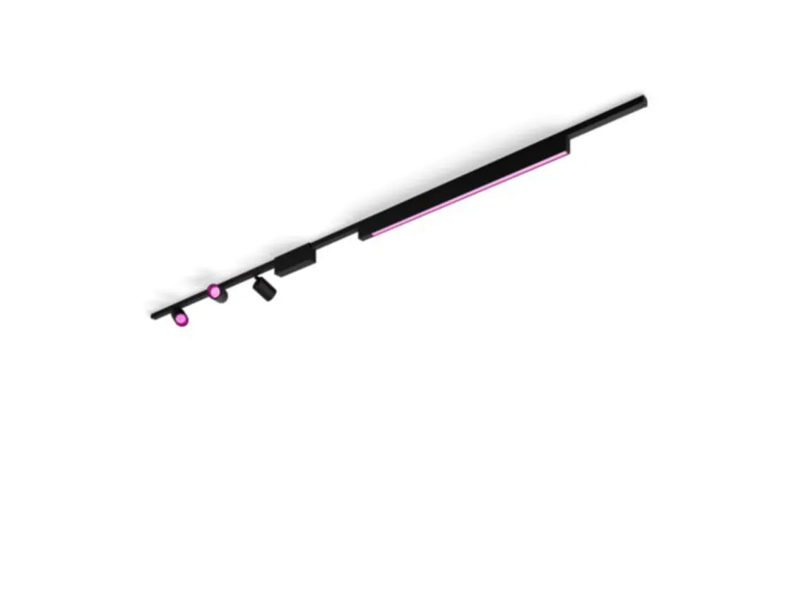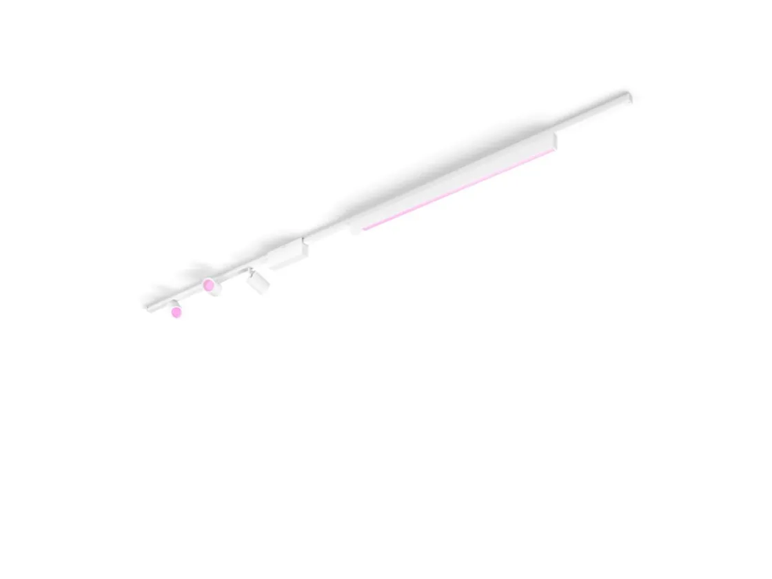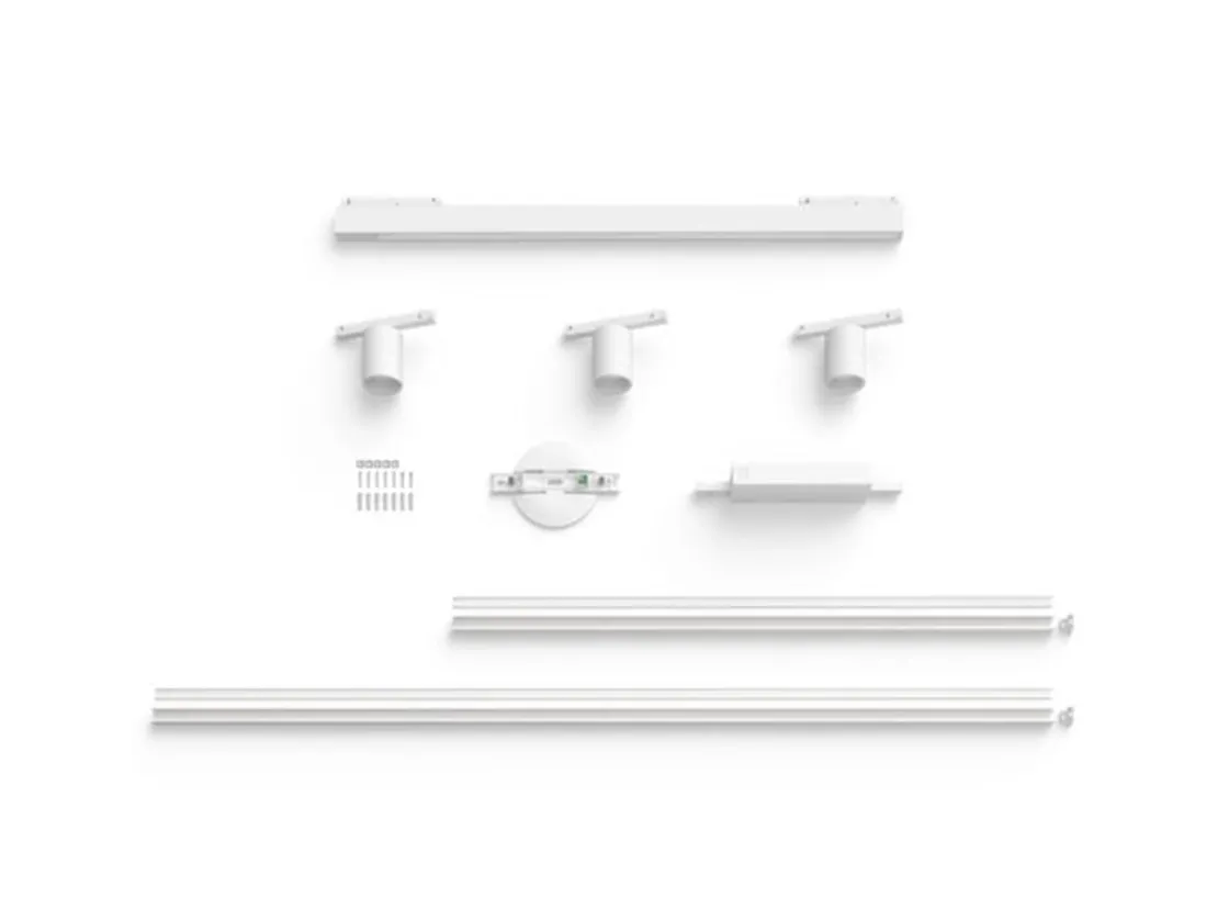 Dette smarte takskinnebelysningssettet i hvitt inkluderer tre sylinderspotlight, en lineær lyslinje, en 1-meters skinne, en 1.5-meters