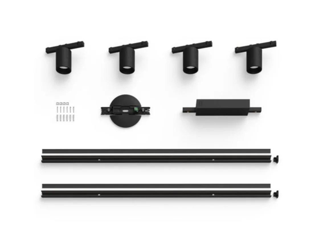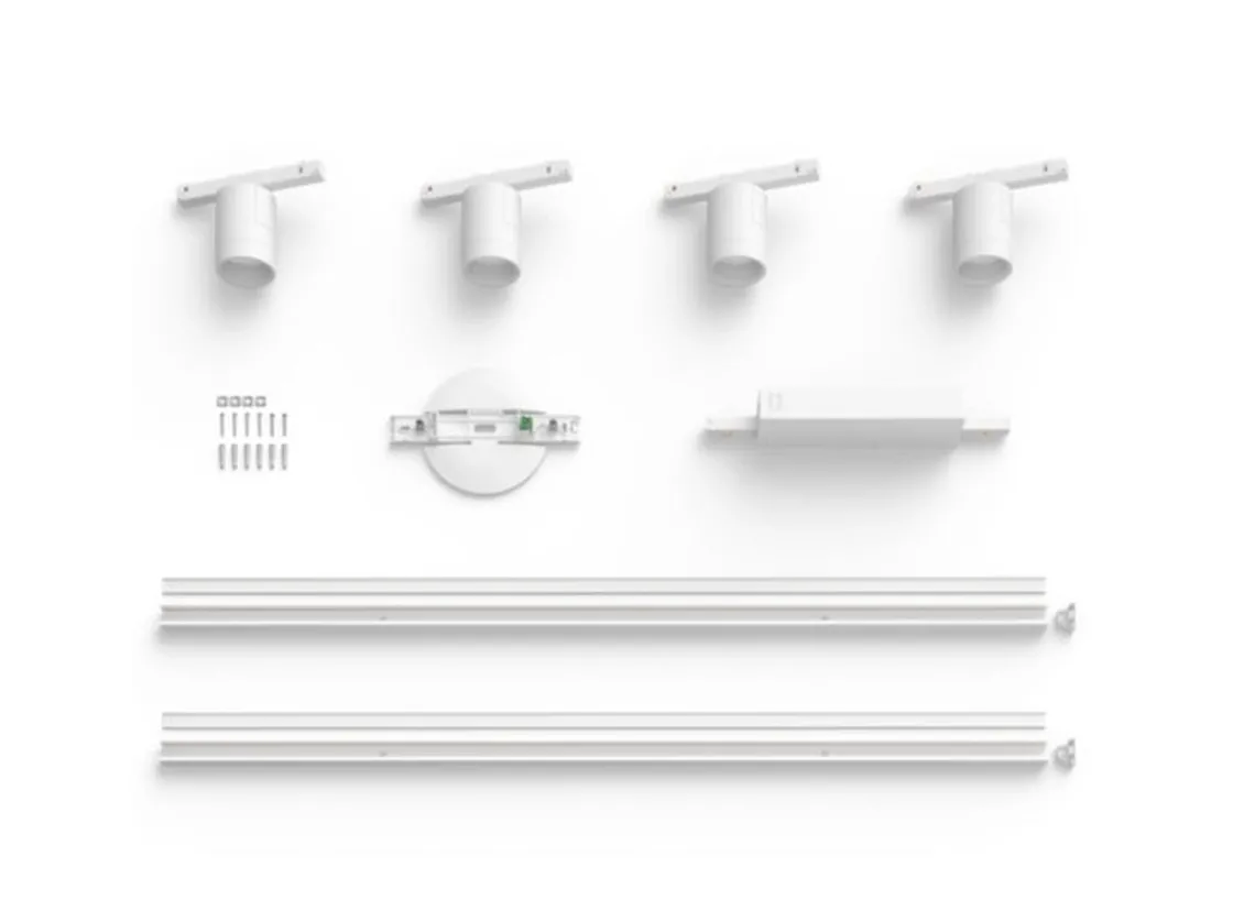 Dette hvite skinnebelysningssettet til tak inkluderer to sylinderspotlight, to pendellamper, to 1-meters skinner og en strømforsyning