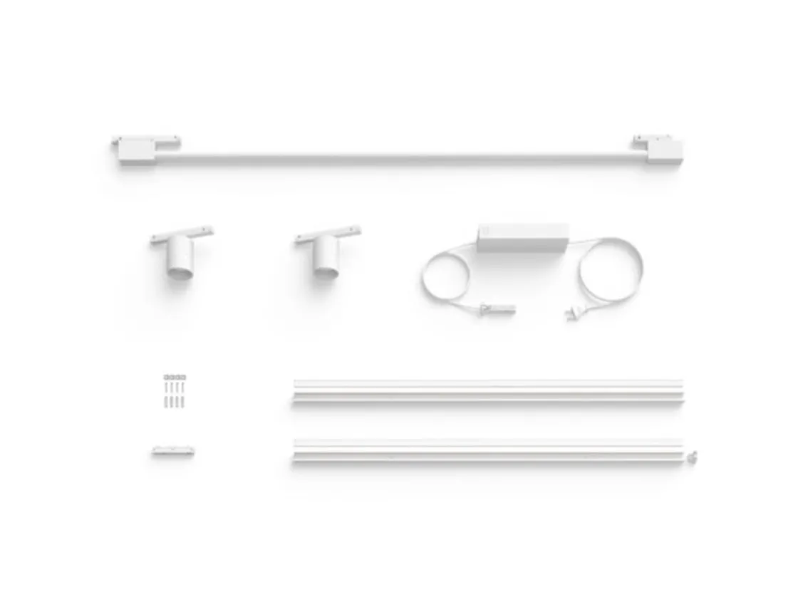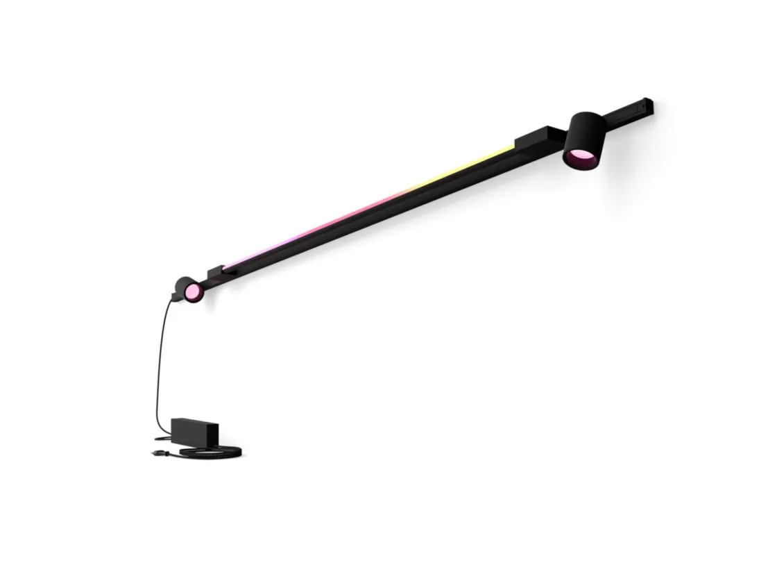 Dette svarte skinnebelysningssettet for vegg inkluderer ett stort gradient lysrør, én sylinderspotlight, to 1-meters skinner, en strømforsyning