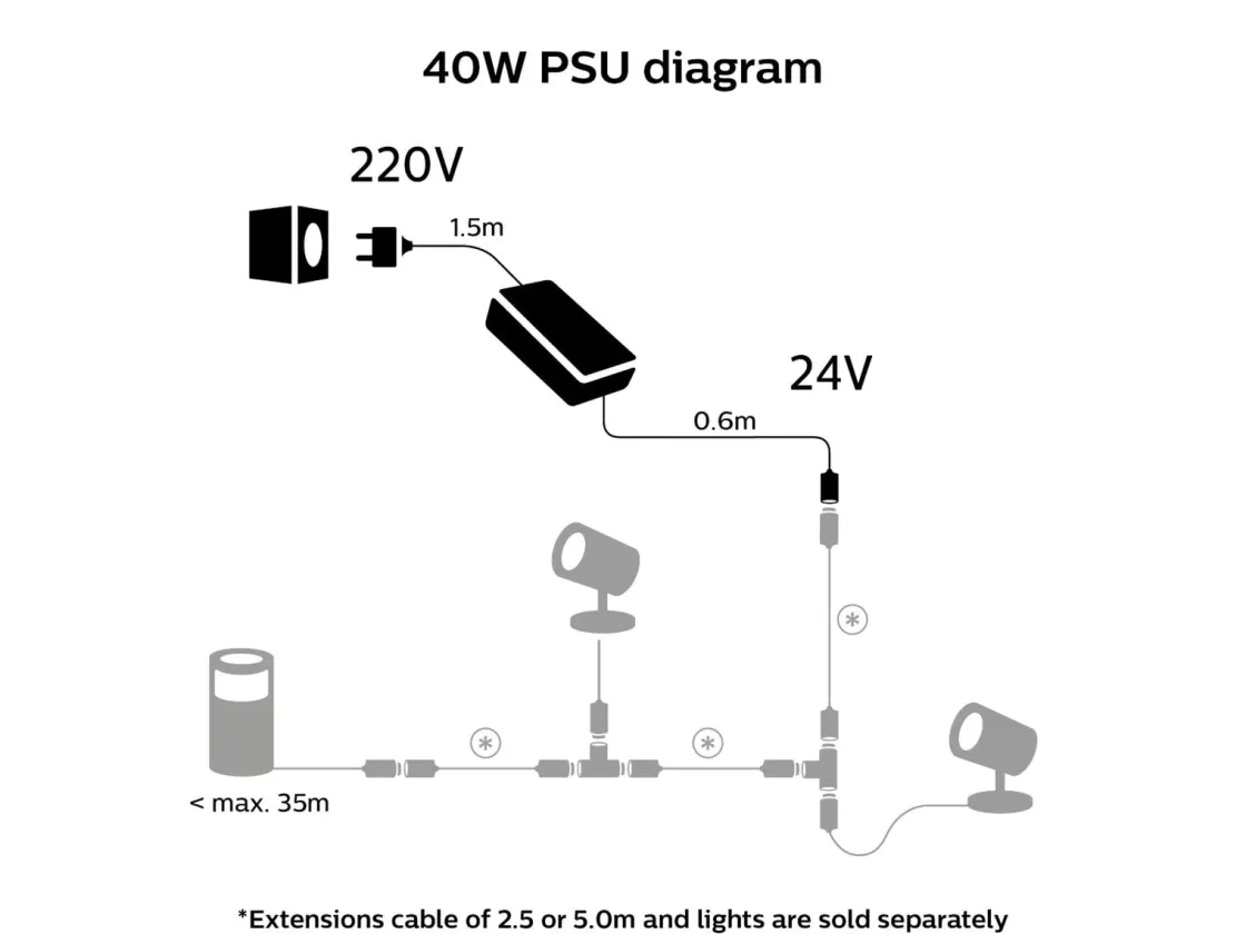 Koble til opptil 35 meter med kabler til en hvilken som helst 12 volts utebelysning fra Philips, og legg til lysarmaturer helt opp til 40 w.