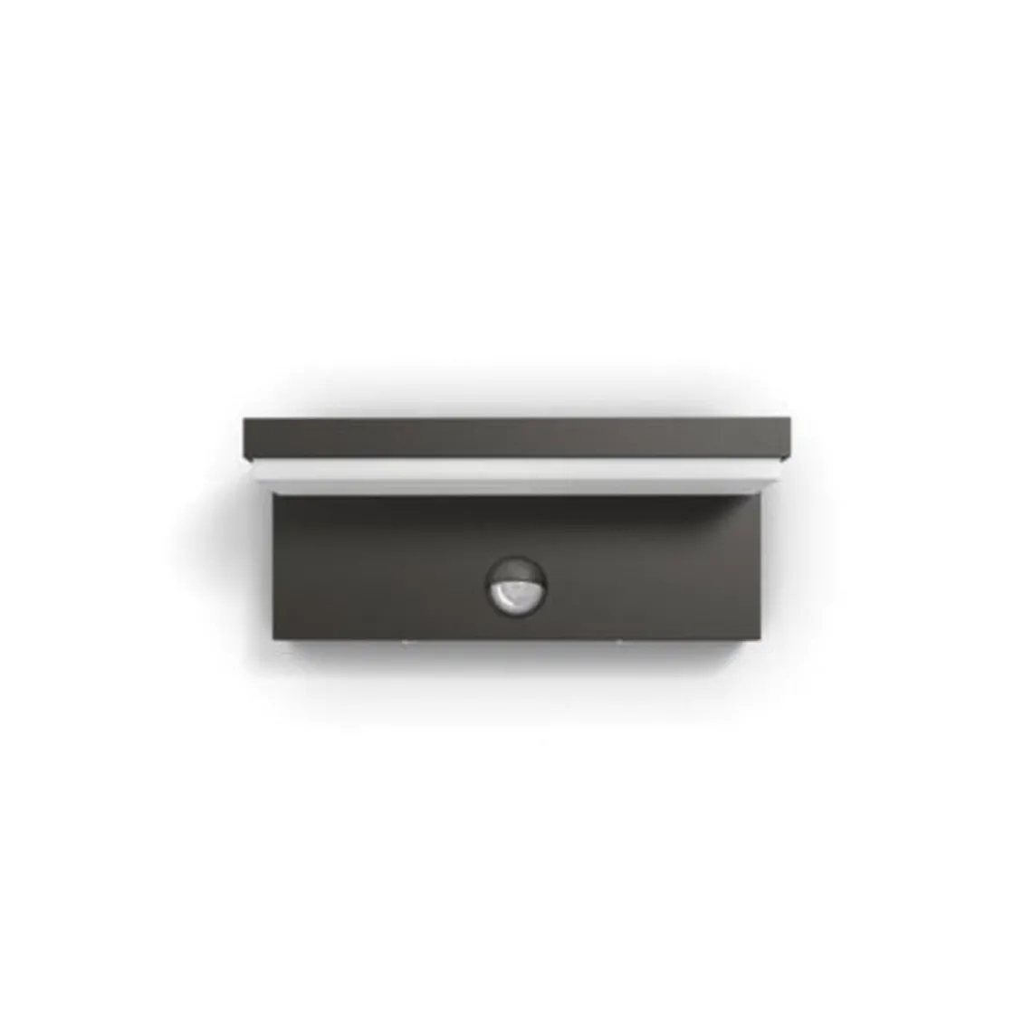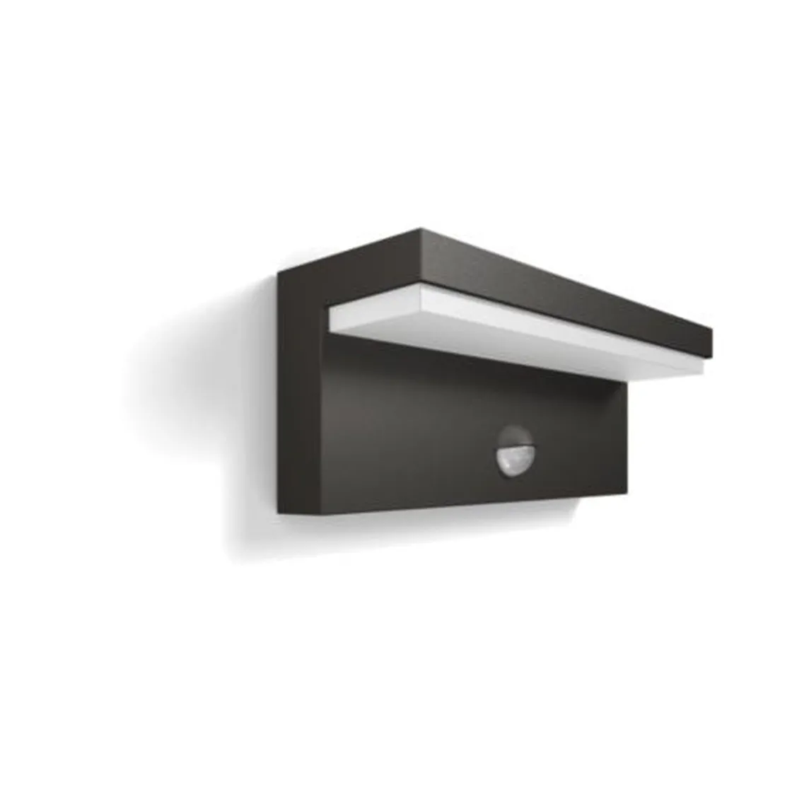 Denne vakre L-formede Philips Bustan-vegglampen i antrasittgrå aluminium av høy kvalitet kaster fra seg et diffust varmhvitt LED-lys på veggen. En bevegelsessensor følger med, slik at den slår seg automatisk på når noen kommer i nærheten.