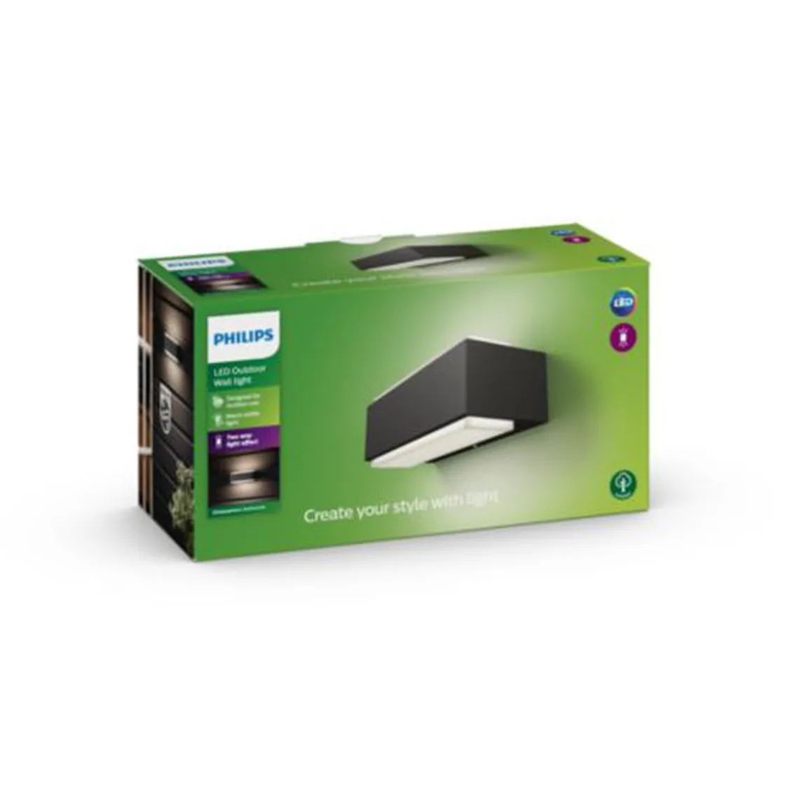 Denne Philips Stratosphere LED-utendørsvegglampen i antrasittgrått er formstøpt i slitesterk aluminium. Designet gir en toveis lyseffekt på veggen din med rikelig med diffust varmhvitt lys