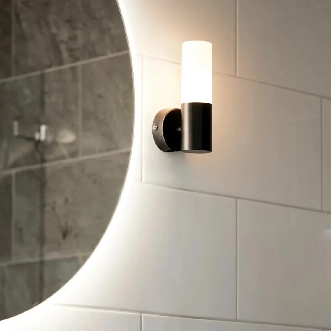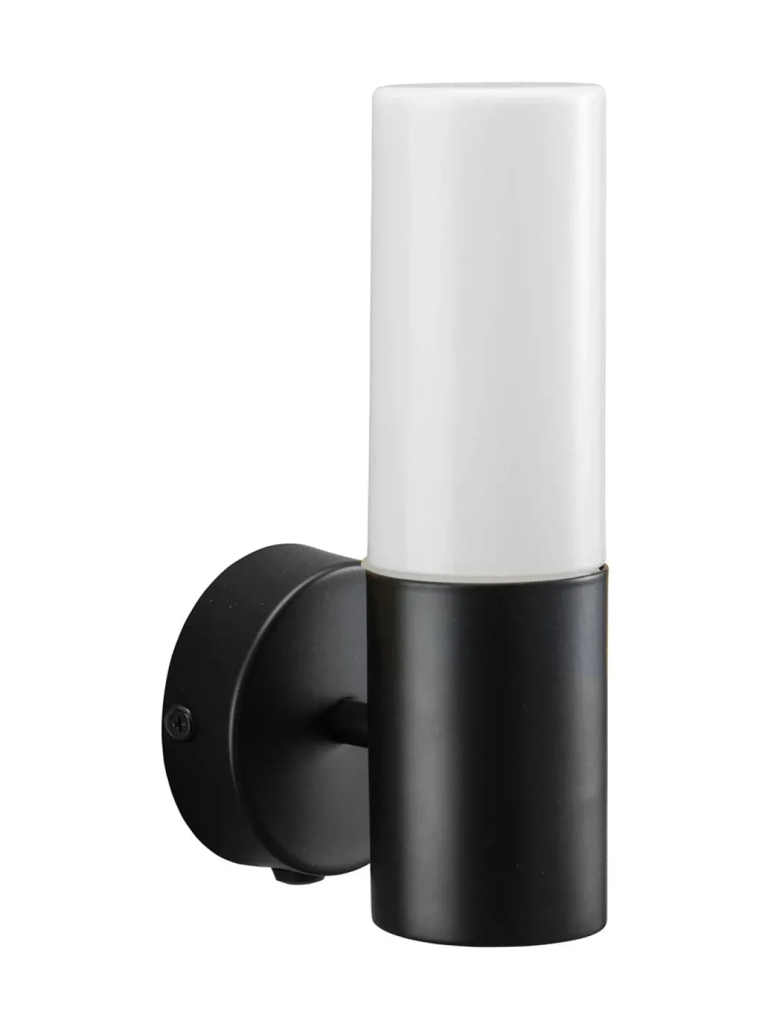 Vegglampe i minimalistisk design med opalglass og metallramme i matt sort. Lampen er beskyttet mot fukt i IP44-klassifisering og passer godt i baderomsmiljøer. Vær oppmerksom på at denne armaturen er for fast installasjon og ikke leveres med separat kontakt og tilkoblingskabel.