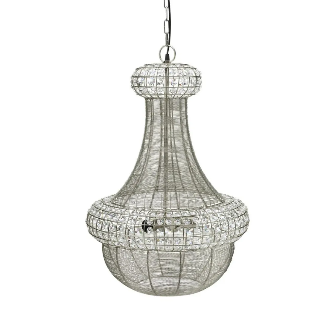 Taklampe Saba i tvunnet metalltråd og detaljer med diamantslipte glassperler. En moderne versjon av den klassiske takkronen. Lampen passer fint over spisebord, over salongbord, på soverom og i en trappeoppgang. Lampen har 80cm kjede og takkopp for krokoppheng i samme farge som lampen.