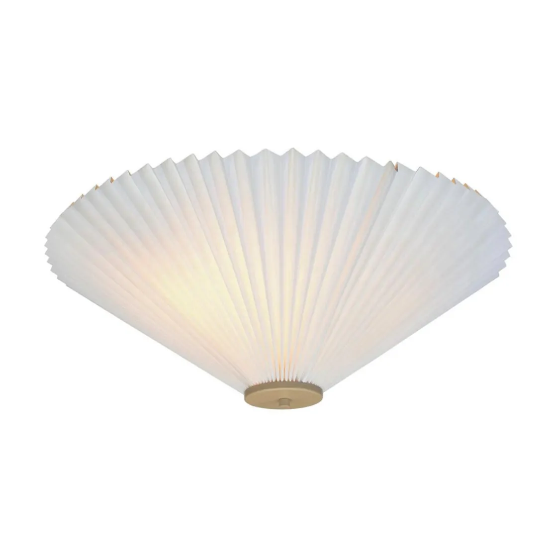 Plafond med lampeskjerm i hvitt papir. Lampen leveres med 3 stk E14 lampeholdere, klargjort for jordet tilkobling og krokoppheng til eksisterende takkontakt. Den øverste delen i beigefarget metall. Når lyset er på, spres det et fint lys i rommet. Perfekt å plassere i gangen, soverommet, stuen eller på kjøkkenet.