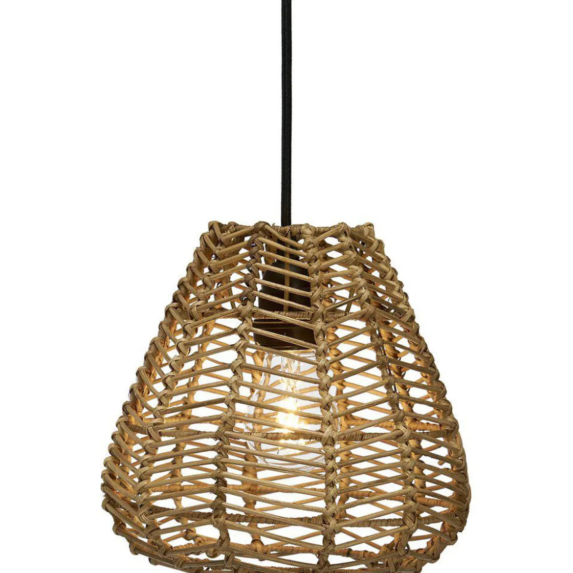 Adelle taklampe i håndflettet sort naturrotting. Skjermen har en behagelig avrundet form og de vakkert vridde detaljene gjør hver skjerm unik. Siden den er laget av naturmaterialer kan det være mindre størrelsesavvik og fargen kan endre seg over tid. Svart takoppheng med takkopp for innendørs bruk medfølger