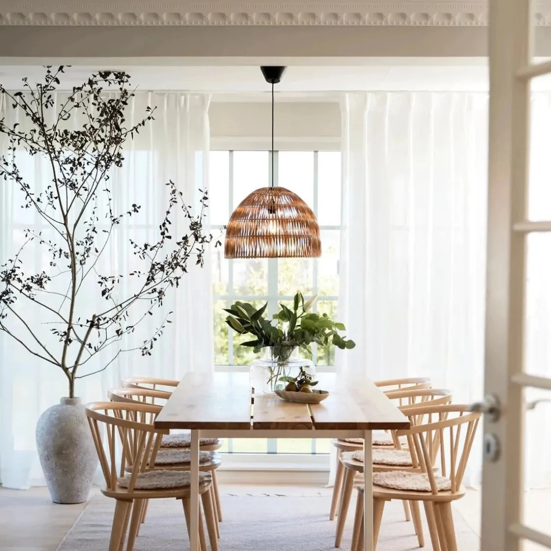 Taklampe Lace i vridd rotting. En håndlaget dekorativ taklampe som skaper en koselig atmosfære og gir en vakker glød når den er tent. Høyde 34cm, bredde 46cm og dybde 46cm. Svart takoppheng med 1,2m ledning inkludert. E27 lampeholder. Maks 40W. Takkontakt og lyskilde medfølger ikke. Naturmaterialet kan endre farge, hver skjerm er håndlaget og det kan være mindre størrelsesavvik.