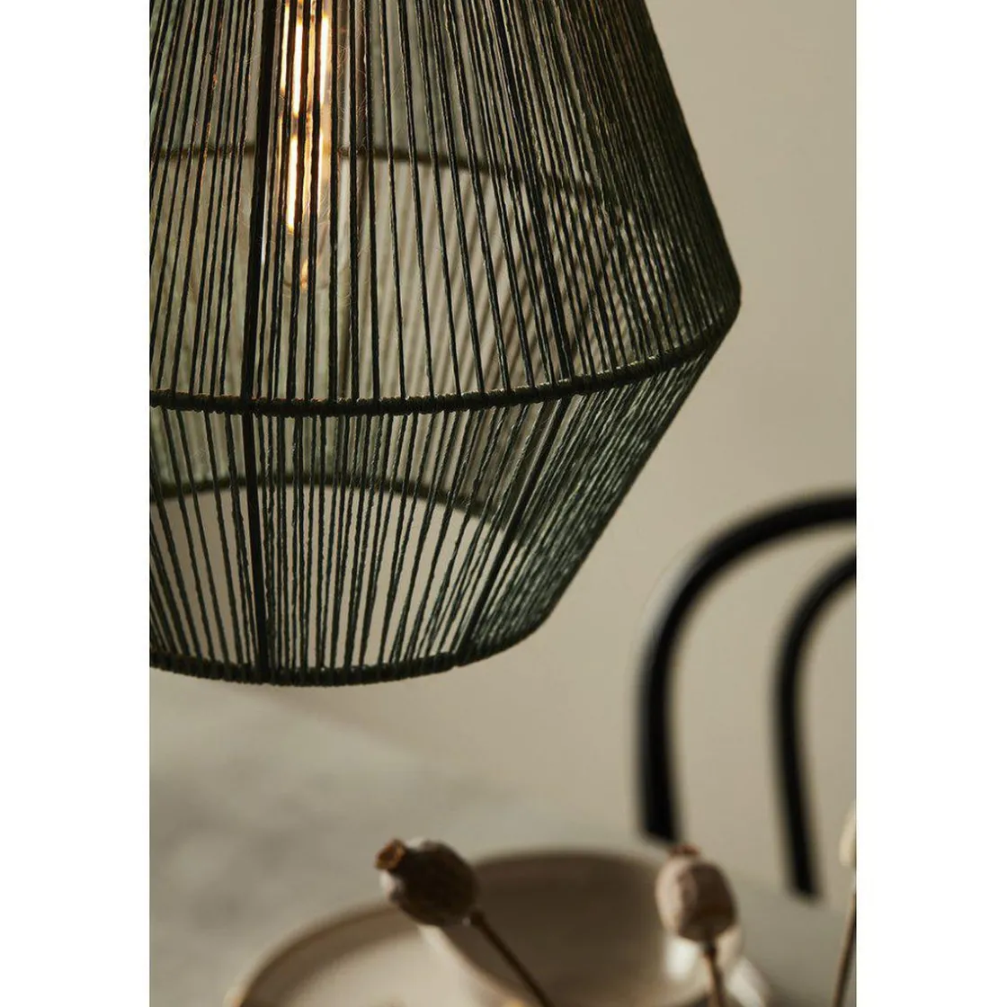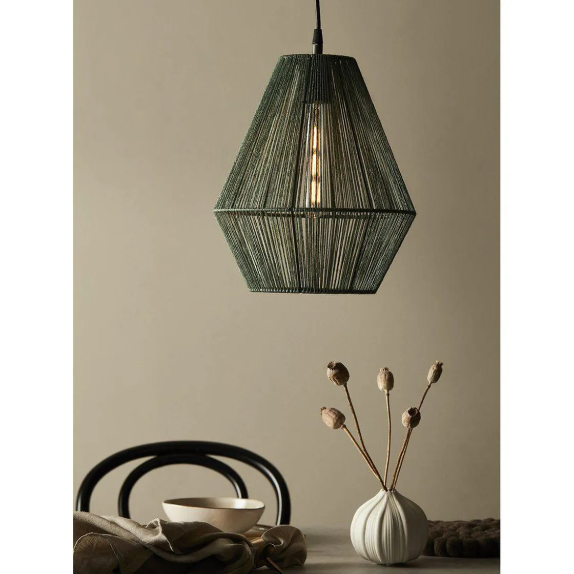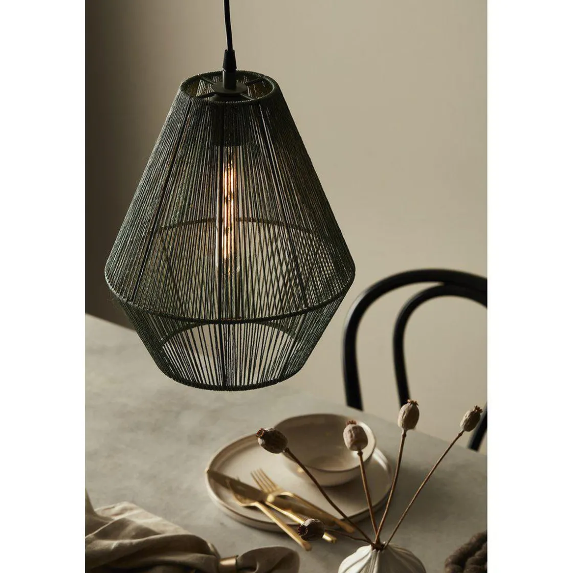 Taklampe Rio med metallramme som er pakket inn i garn for hånd og filtrerer lyset fint gjennom ledningene. Moderne geometrisk form som passer til den skandinaviske stilen.