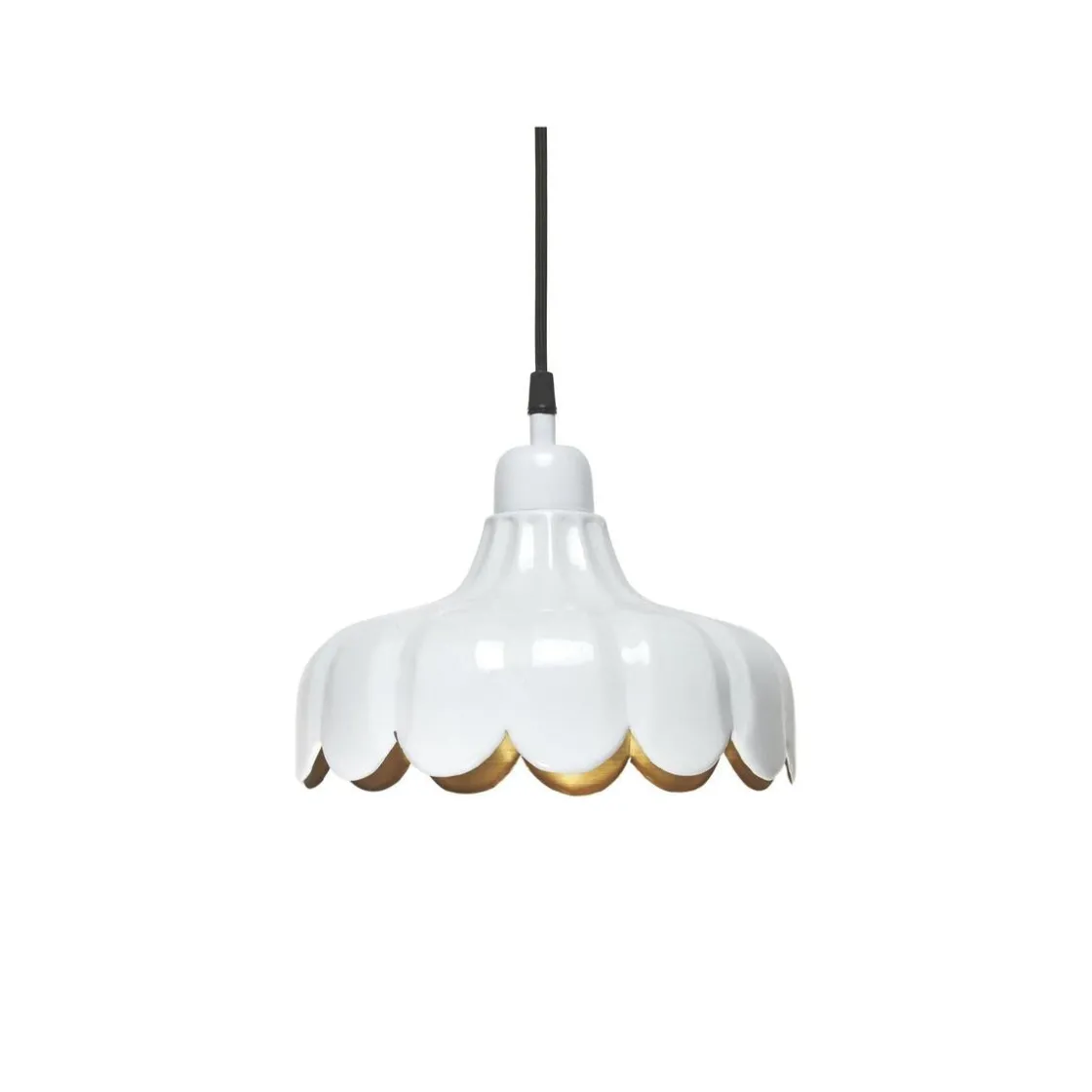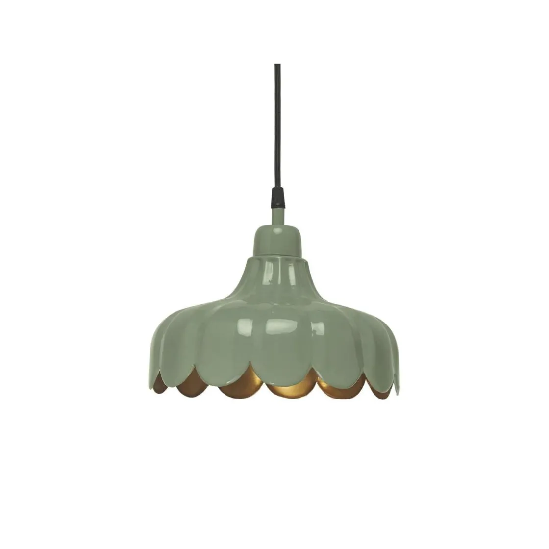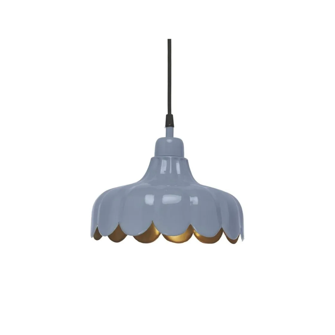 Liten pendellampe, Wells, i metall. Vår serie Wells er designet og inspirert av blomsterblader. Finnes i flere farger og modeller. Alle med gullfarget innside som gir en varm glød.