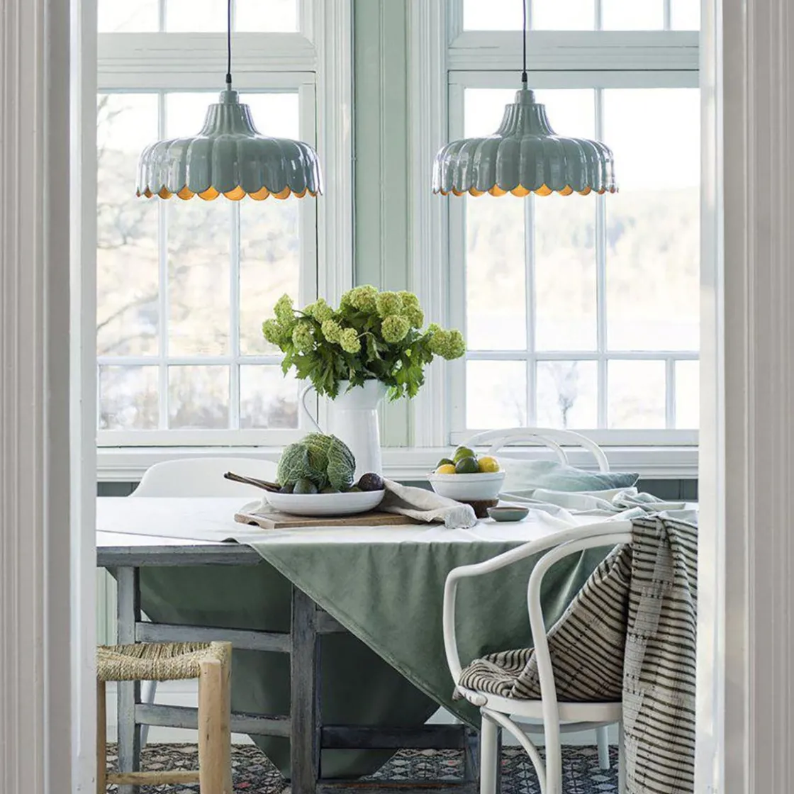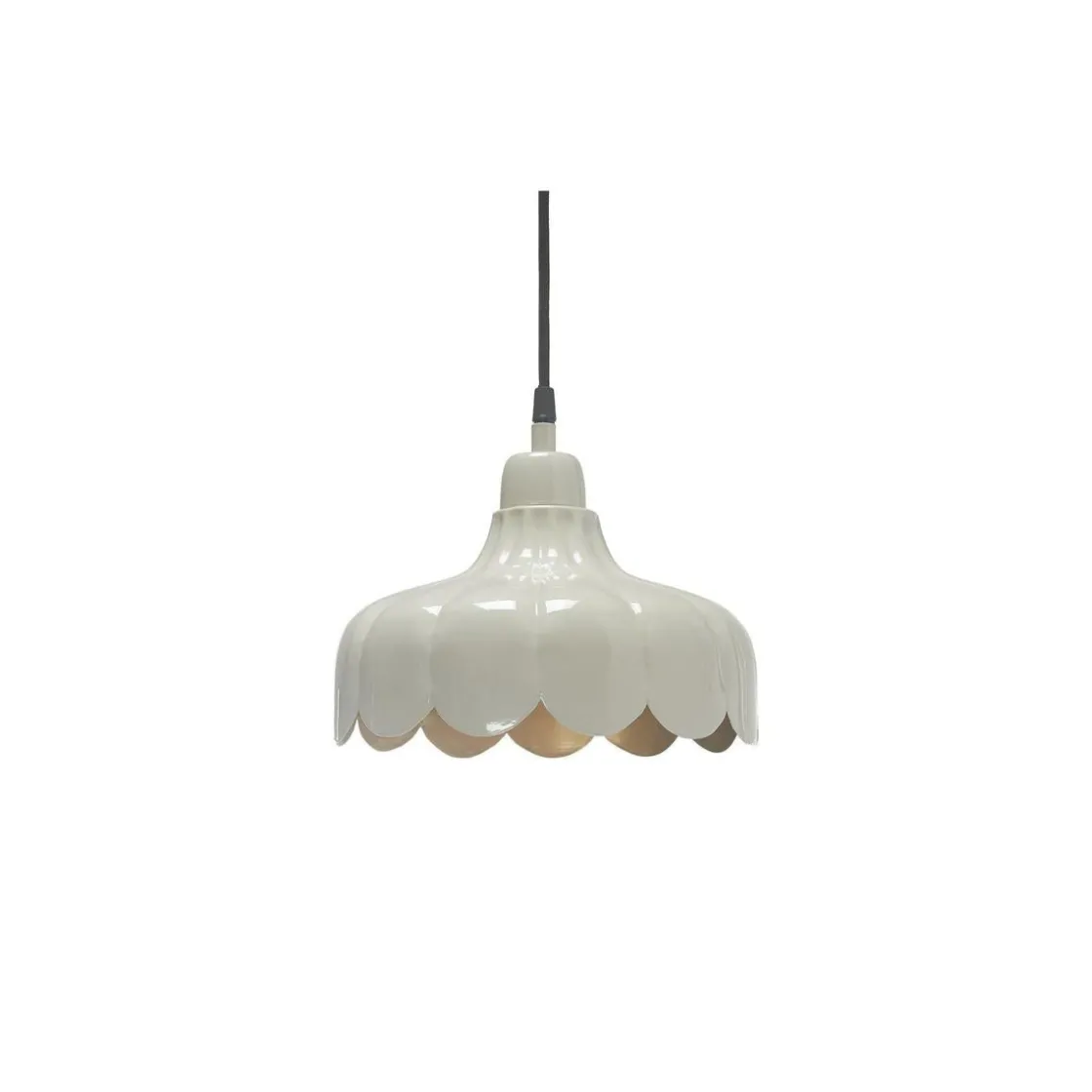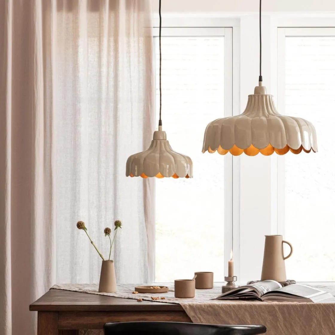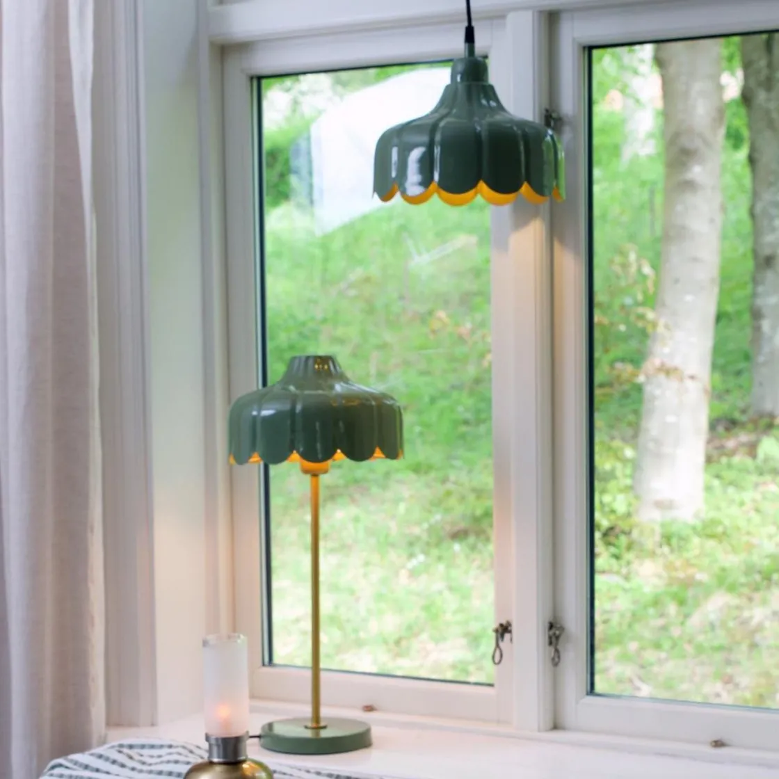 Liten pendellampe, Wells, i metall. Vår serie Wells er designet og inspirert av blomsterblader. Finnes i flere farger og modeller. Alle med gullfarget innside som gir en varm glød.