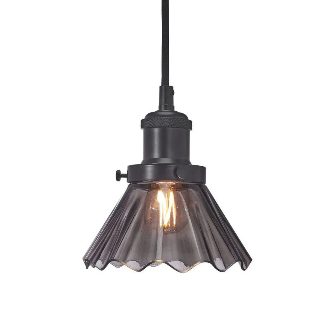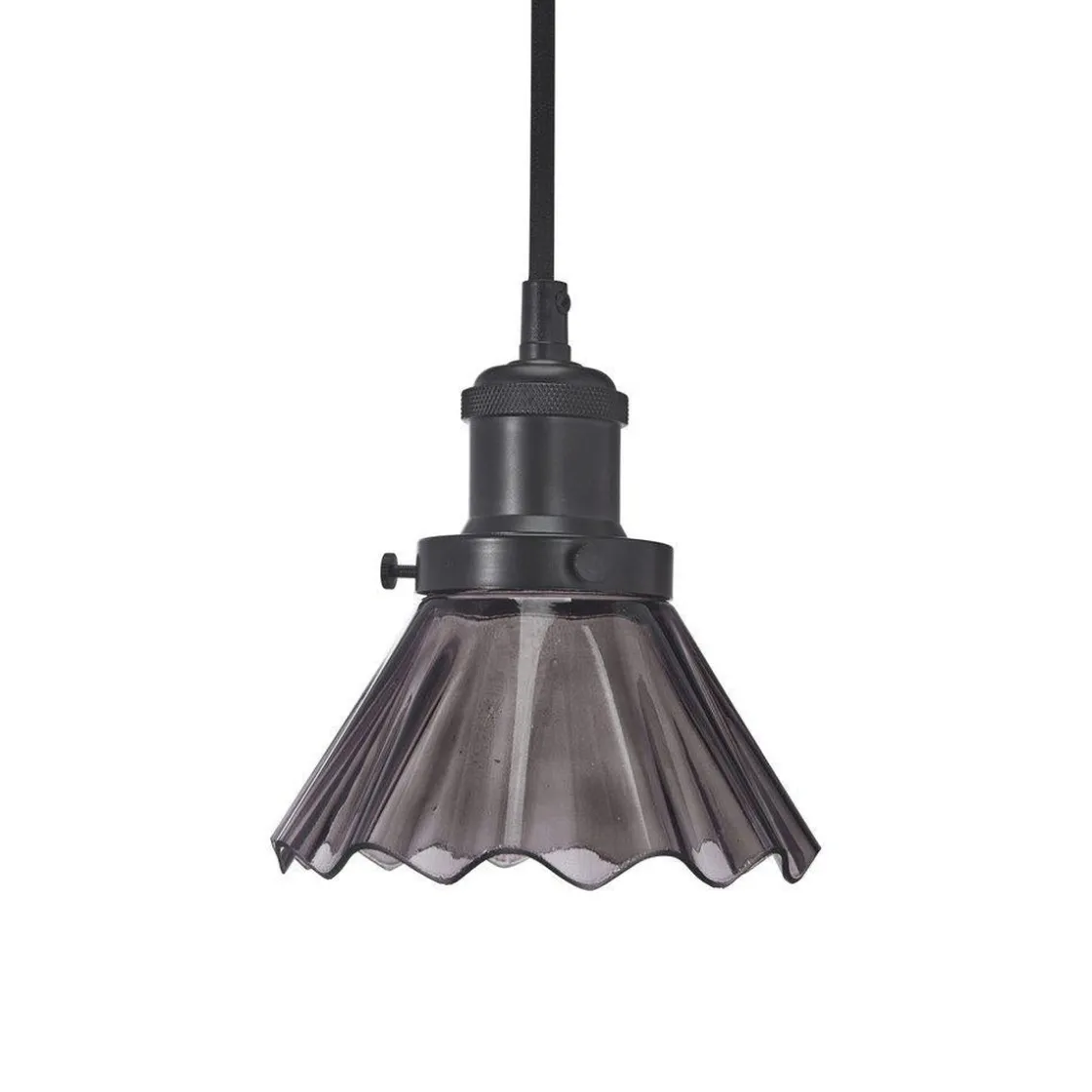 August, klassisk skomakerlampe med sort glasskjerm og lampeholder i matt sort metall i et vakkert plisse mønster, passer like godt i vinduet som over kjøkkenbenken.