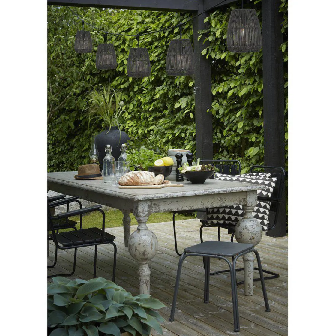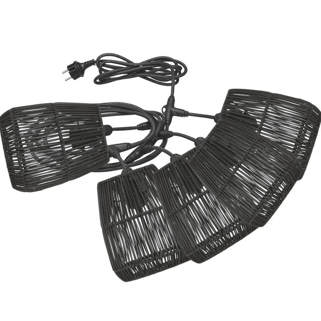 Flex Out Lysslynge til utendørsbruk med 5 stk Saigon lampeskjermer i sort kunstrotting. Skjermen er 18 cm bred og 20 cm høy.