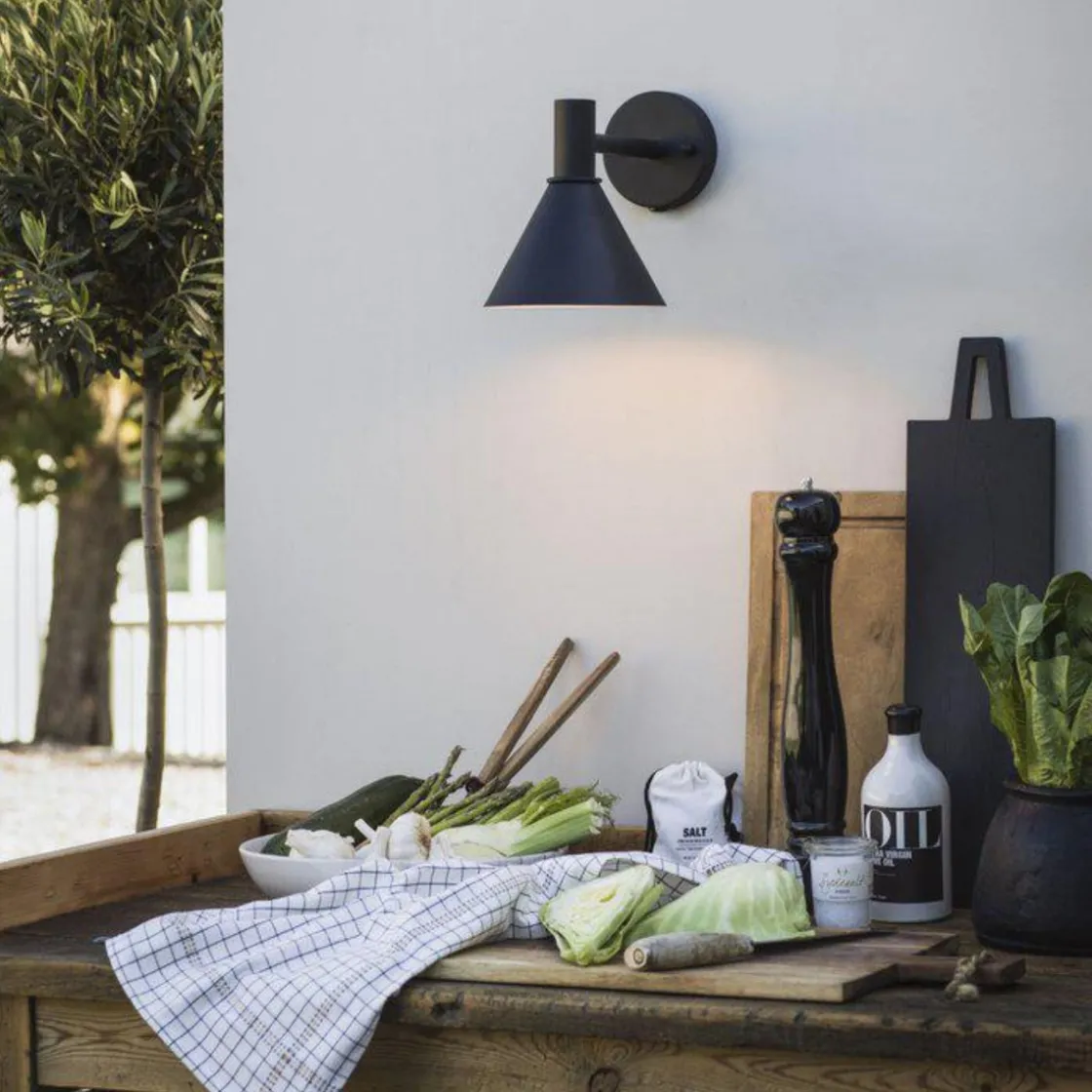 En elegant vegglampe i pulverlakkert metall. Godkjent for utendørs bruk.
