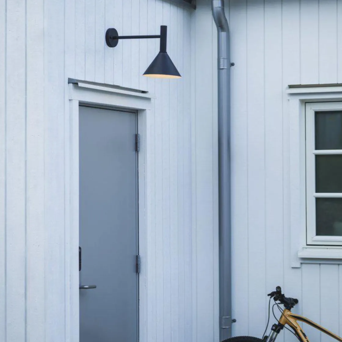 En elegant vegglampe i pulverlakkert metall. Godkjent for utendørs bruk.