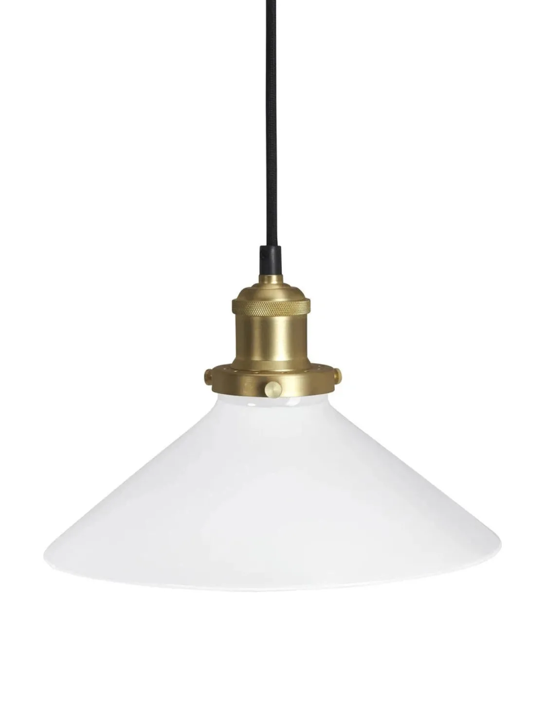 August, klassisk skomakerlampe med hvit glasskjerm og lampeholder i messingfarget metall, passer like godt i vinduet som over kjøkkenbenken.