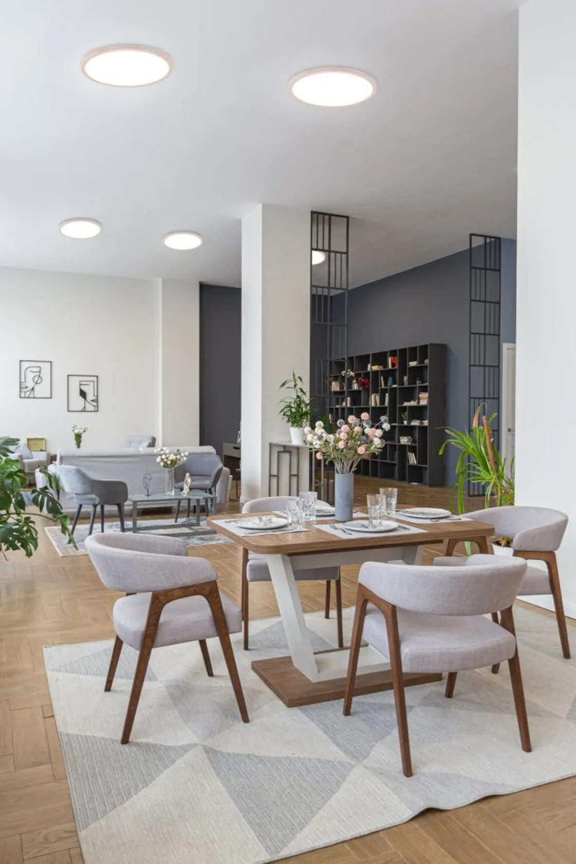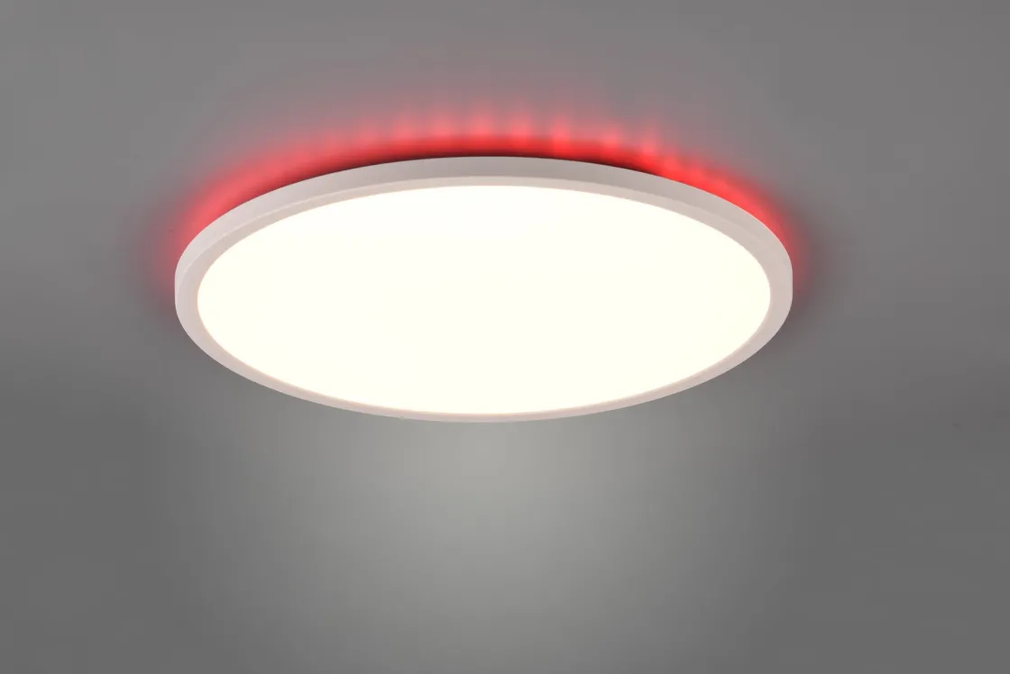 Aureo er en slank taklampe som leveres med fjernkontroll. Med fjernkontrollen kan lampen dimmes, slås av/på, endre fargetemperatur og farget lys, samt lampen kan settes i nattmodus.