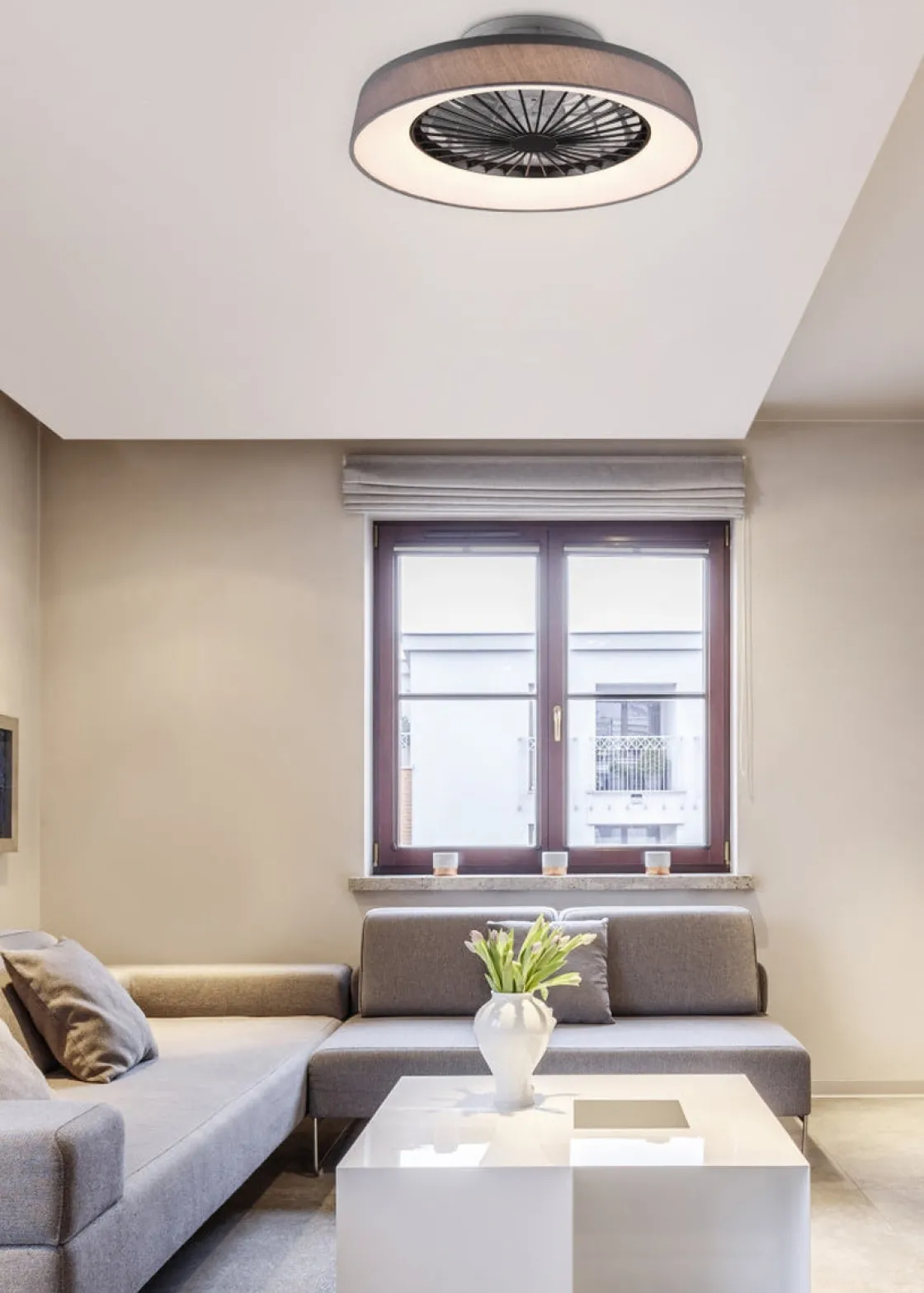Farsund er en stilren vifte med lys og fjernkontroll. Det er mulig å skifte fargetemperaturen i lyset mellom 3000 kelvin til 6000 kelvin, da bestemmer du selv om du ønsker varhvit eller kjøligere fargetemperatur