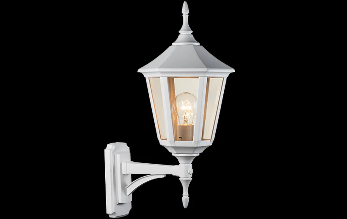 Klassisk veggarmatur for utendørs bruk, produsert i trykkstøpt aluminium med pulverlakkert sort eller hvit overflate. Kan med enkle grep gjøres om til nedhengt modell. Armaturen har E27-sokkel