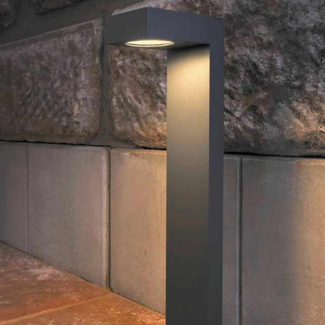 Kvadratisk stående armatur QUADRASYL 75 laget av lakkert aluminium. Kapslingsklassen IP44 gjør armaturet egnet for utendørs bruk.