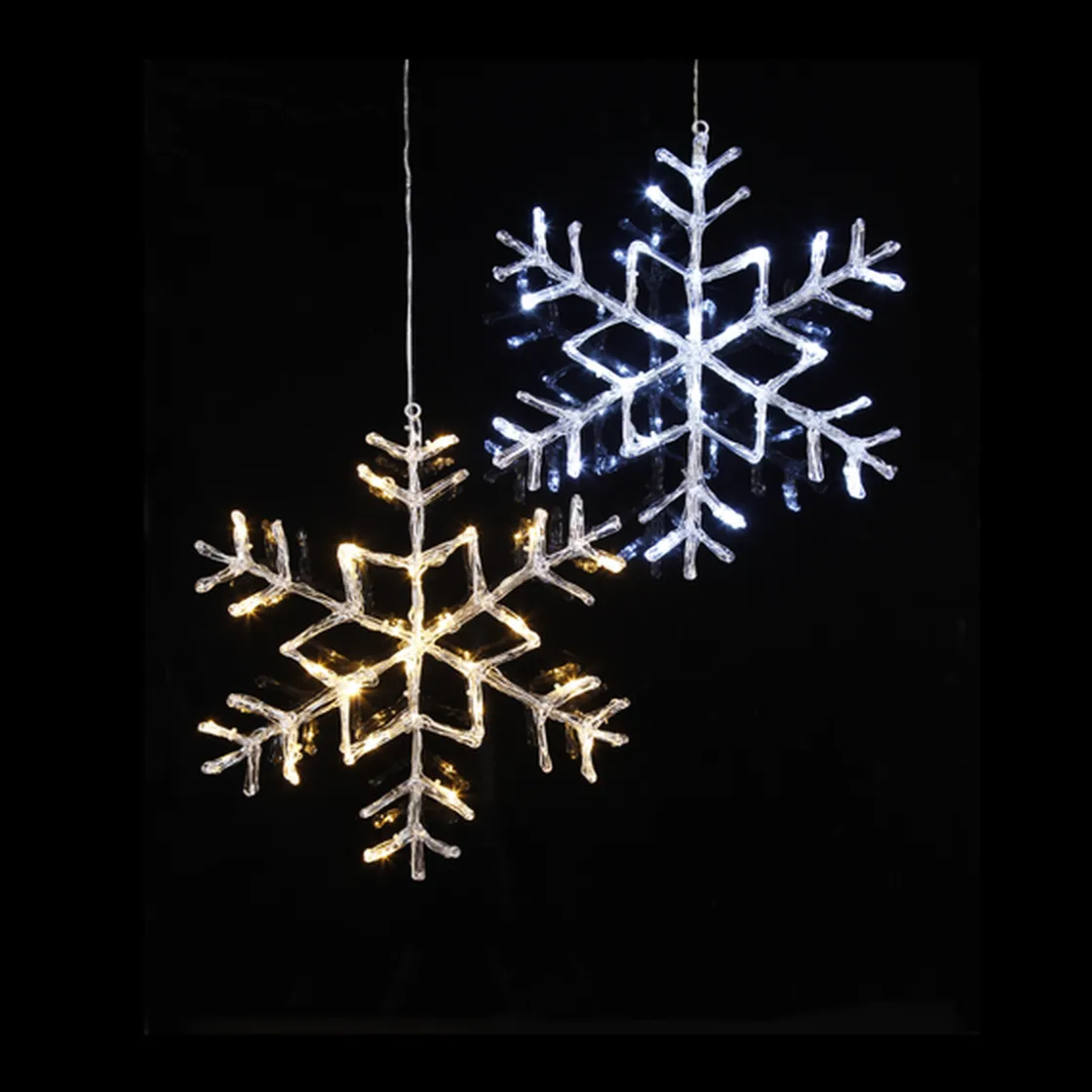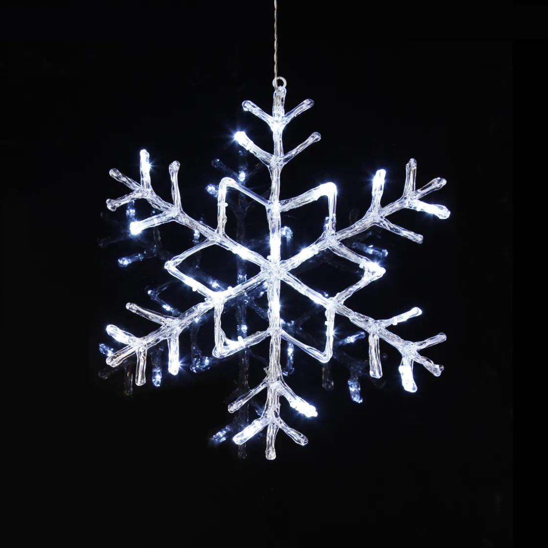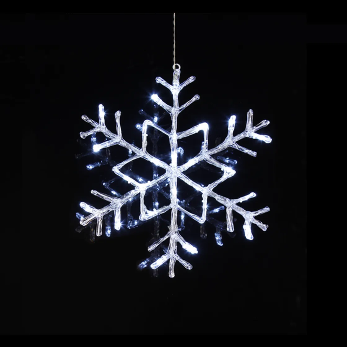 Hengende snøfnugg for utendørs bruk. Vakker dekor til å henge i hagen. Snøfnugget gir en fin glød og skaper en fantastisk atmosfære i mørket.