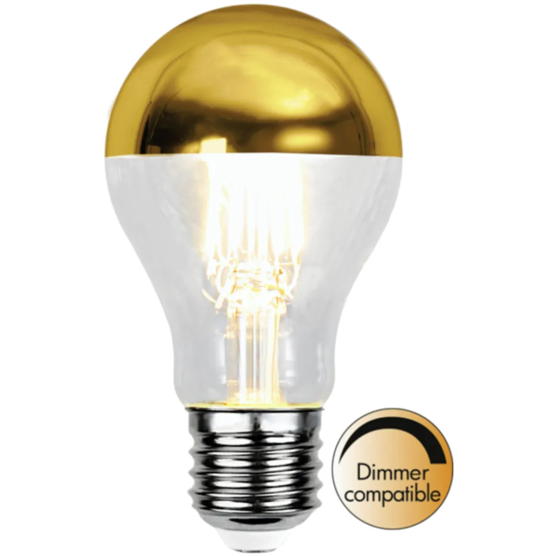 Lyspæren gir et fint og behagelig indirekte lys. Den gullfargede toppen hindrer lyset i å være blendende, noe som gjør at den passer perfekt til en taklampe eller vegglampe med stor åpen lampeskjerm.