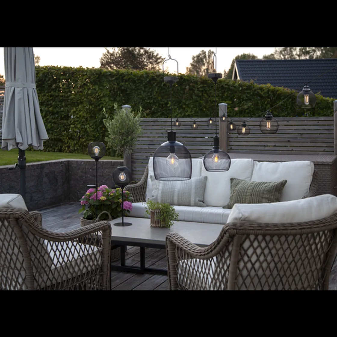 Solcelledrevet lampe i sort metall. Fin dekorasjon til å henge i en pergola, i hagen eller på balkongen. Lyser med 10 lumen etter skumring.