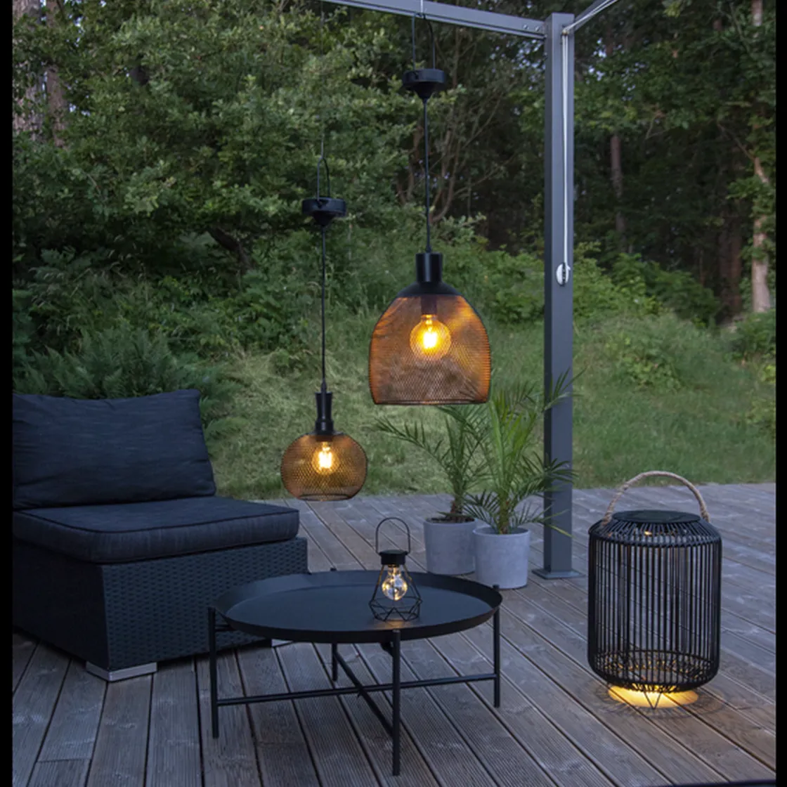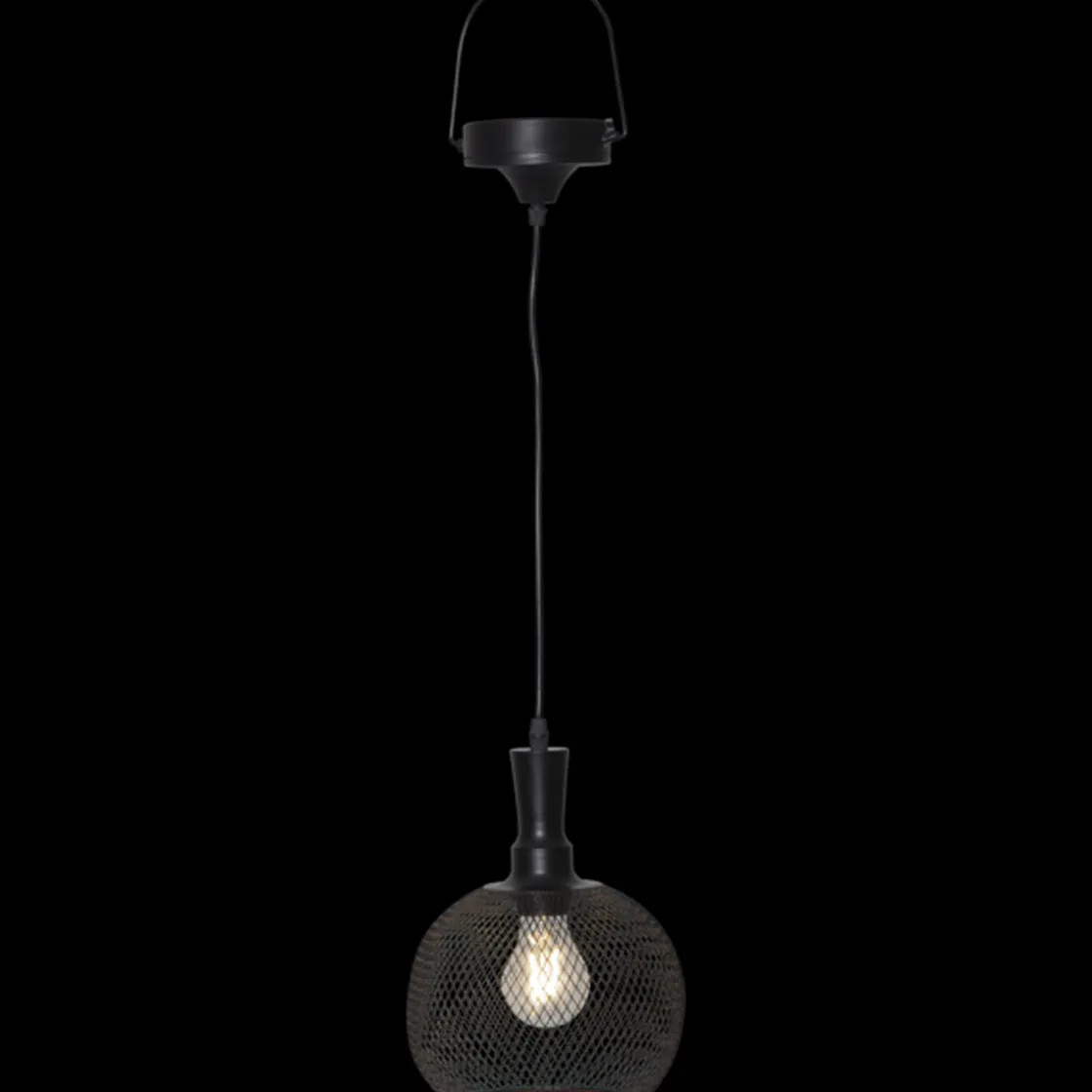 Solcelledrevet lampe i sort metall. Fin dekorasjon til å henge i en pergola, i hagen eller på balkongen. Lyser med 5 lumen etter skumring.