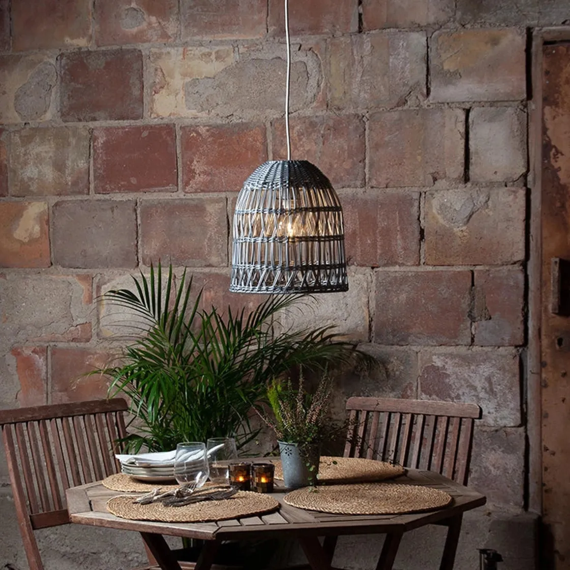 Nydelig lampeskjerm i kunstrotting som er egnet for utendørsbruk. Lampeskjermen er 33 cm høy og 30 cm i diameter.