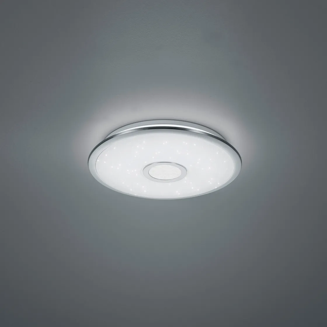 Taklampe som også kan brukes på vegg, med integrert dimmer og fjernkontroll, nattlysfunksjon, stjernelyseffekt, minnefunksjon, lysfargestyring og spesielt egnet for soverom.