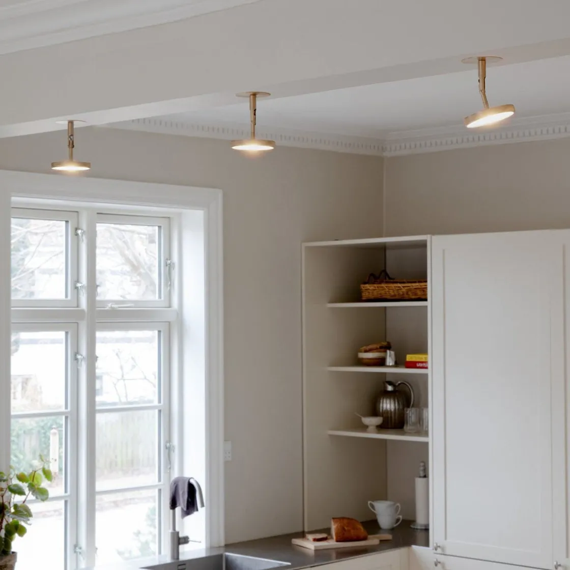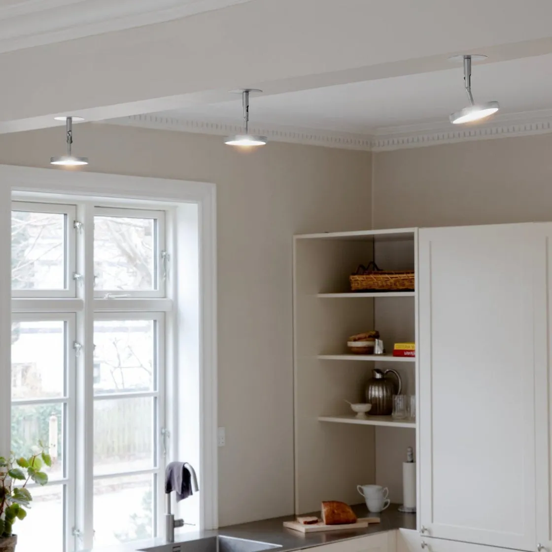 Skjermen på lampen er fleksibel, slik at du kan justere vinkelen på lyset og sørge for belysning akkurat der du ønsker det. Asteria Spot kan installeres innfelt eller monteres direkte på overflaten av et tak eller en vegg.