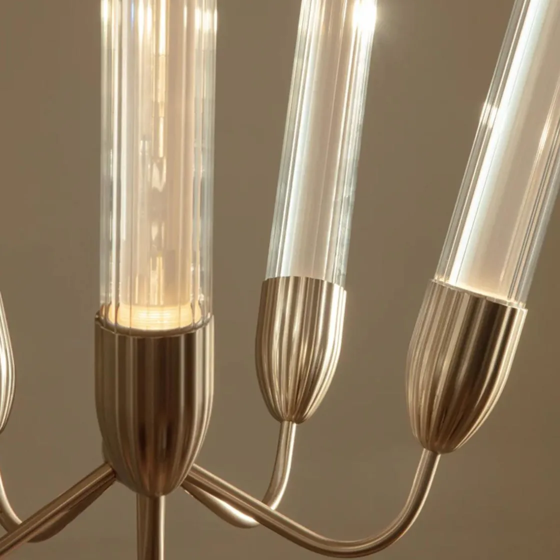 Den unike teksturen på glasset fanger lyset, mens en diffuser i kjernen av hvert lystråd sikrer myk og jevn belysning som skaper en innbydende atmosfære for enhver anledning.